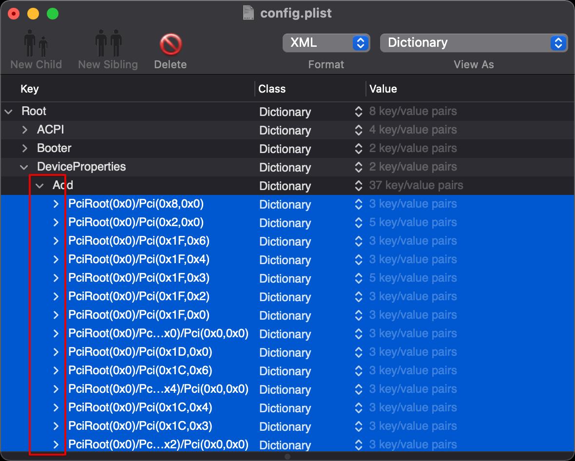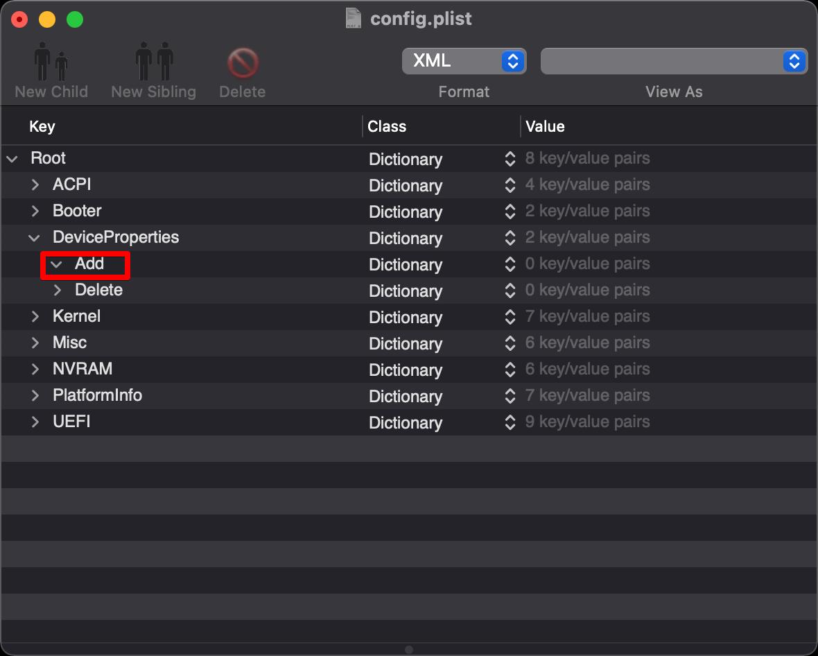 먼저 config.plist를 열고, DeviceProperties - Add를 엽니다.