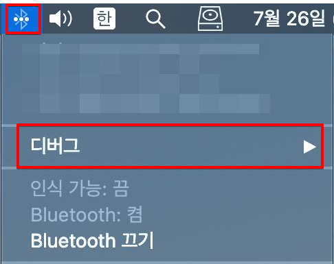 상단 Task Bar의 Bluetooth 아이콘을 클릭해주면 따로 디버그 항목이 나타나지 않고 바로 항목이 나타납니다.