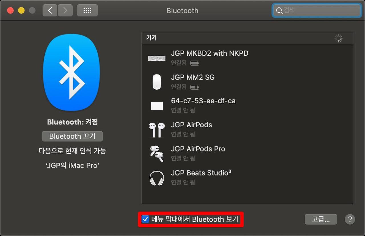 '메뉴 막대에서 Bluetooth 보기'에 체크하면 상단 Task Bar에 Bluetooth 아이콘이 나타납니다.
