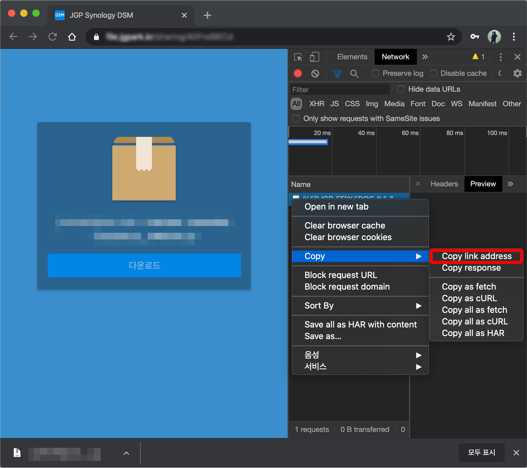 Synology에 부가적인 패키지를 설치하거나 특별한 설정을 거치지 않고, File Station과 Chrome 브라우저를 사용하기만 한다면 즉시 직링크를 추출해낼 수 있습니다.