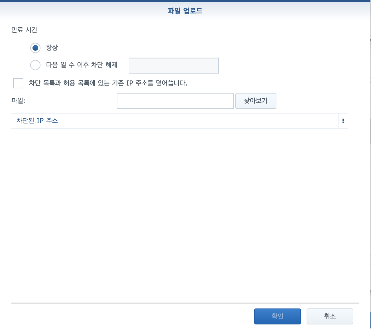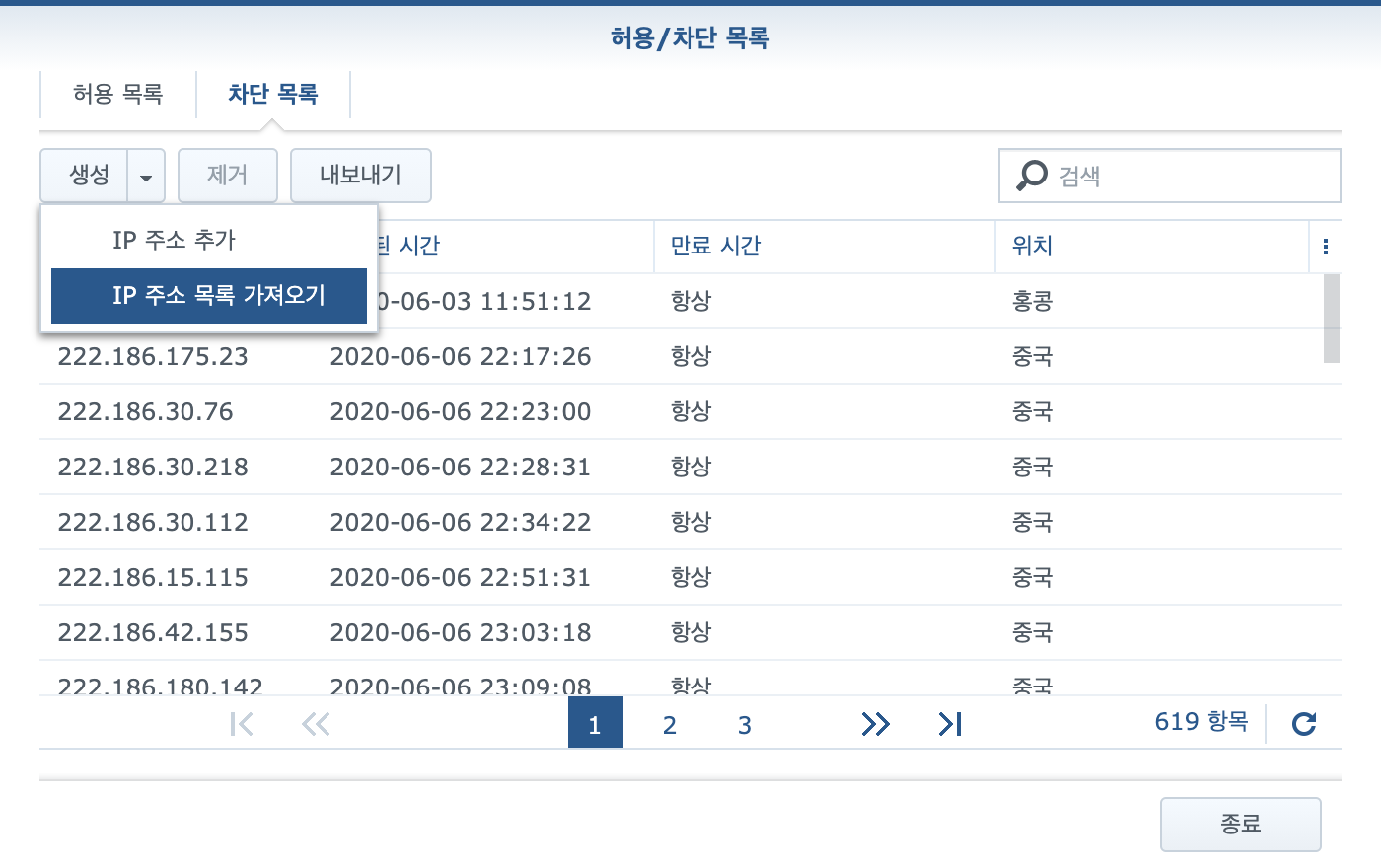 제어판 - 보안 - 계정 - 허용/차단 목록 - 차단목록 선택 후, 생성 옆에 삼각형을 눌러서 "IP 주소 목록 가져오기"를 선택합니다.