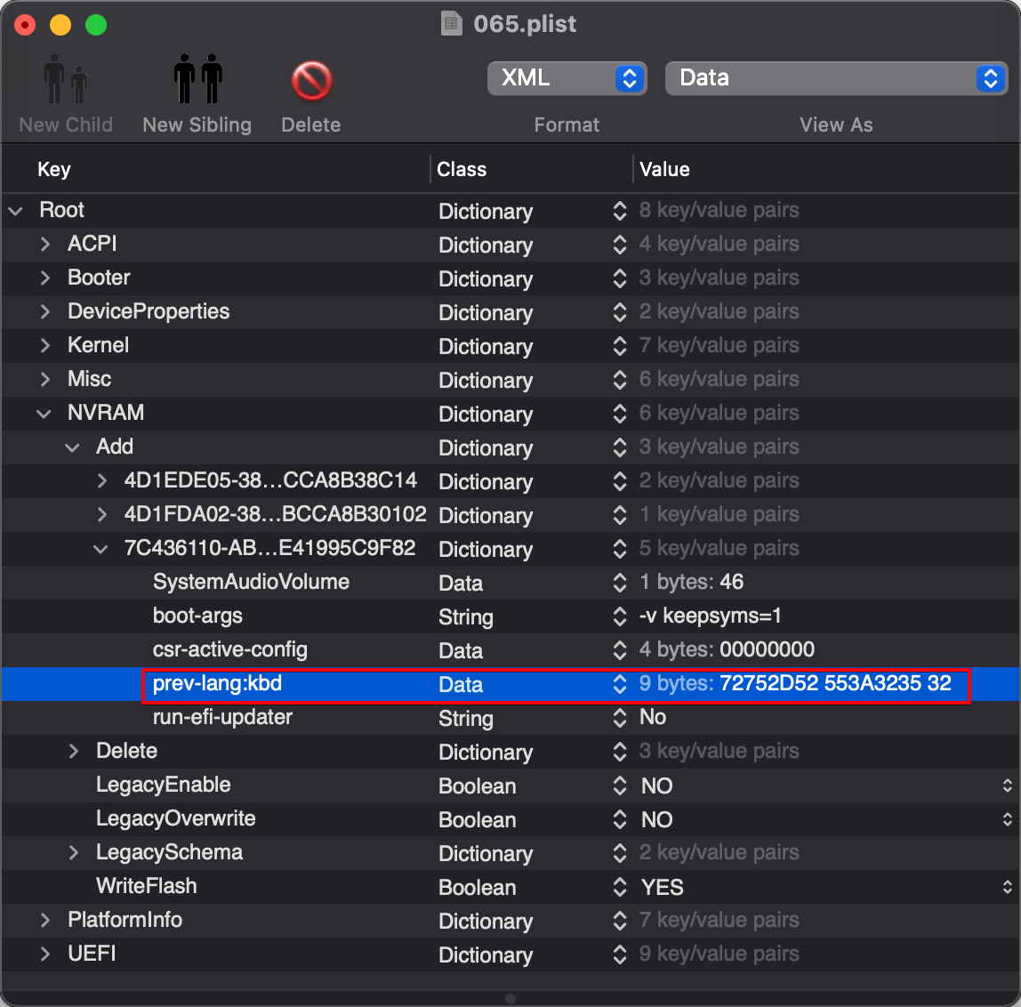 당황하지 말고~ Sample.plist를 열고, NVRAM - Add - 7C436110-AB2A-4BBB-A880-FE41995C9F82 - prev-lang:kbd 항목을 살펴봅시다.