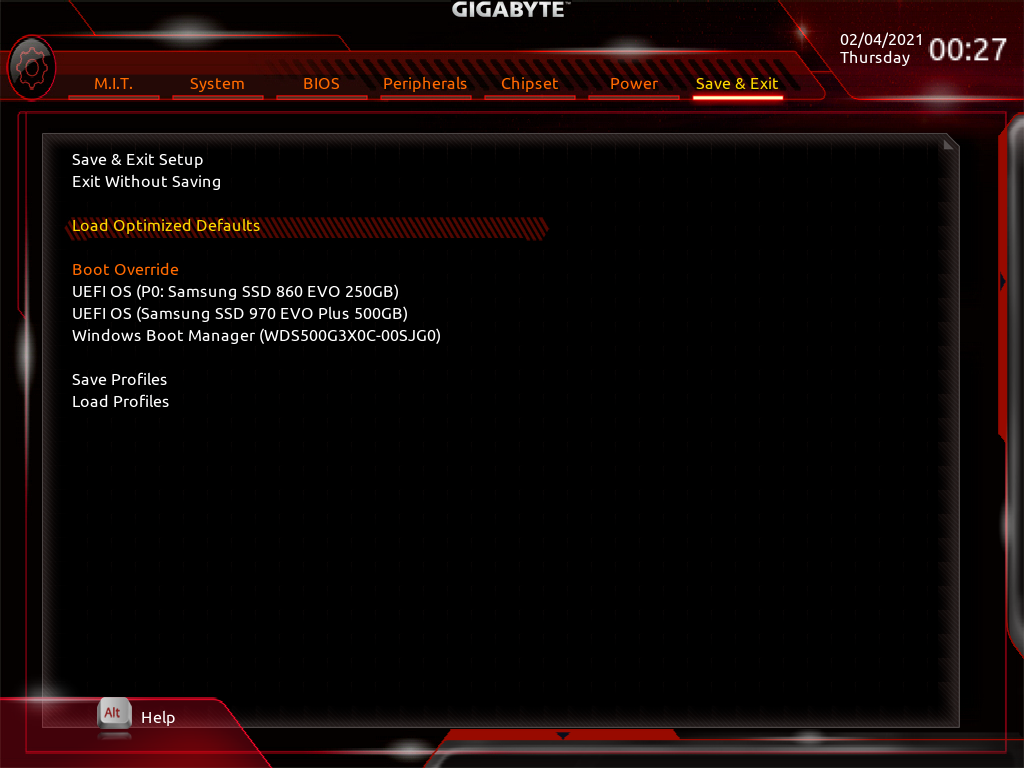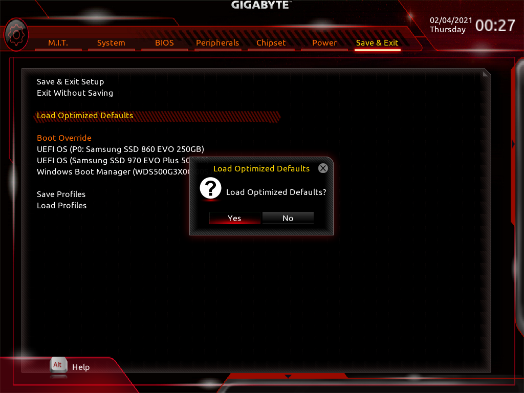 - Save & Exit→ Load Optimized Defaults 로 값들을 모두 초기 설정 상태로 돌립니다.