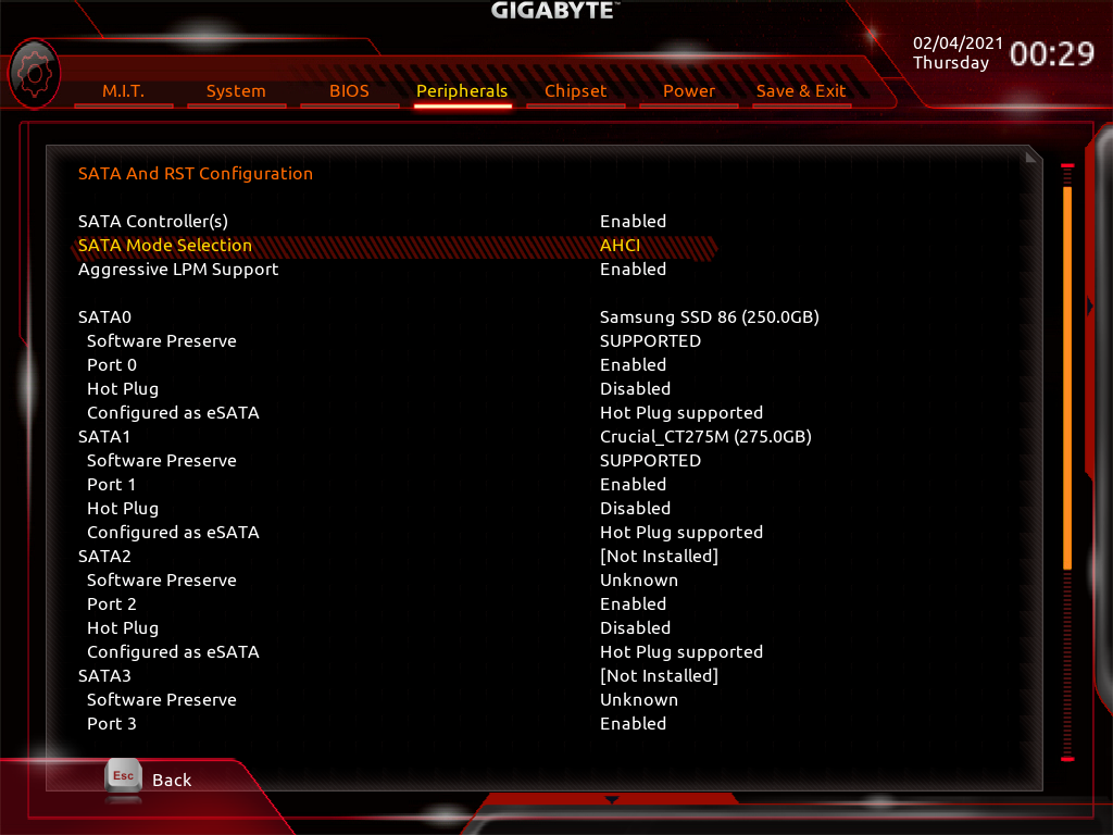Peripherals → SATA And RST Configuration → SATA Mode Selection의 값을 AHCI로 변경해야 합니다.