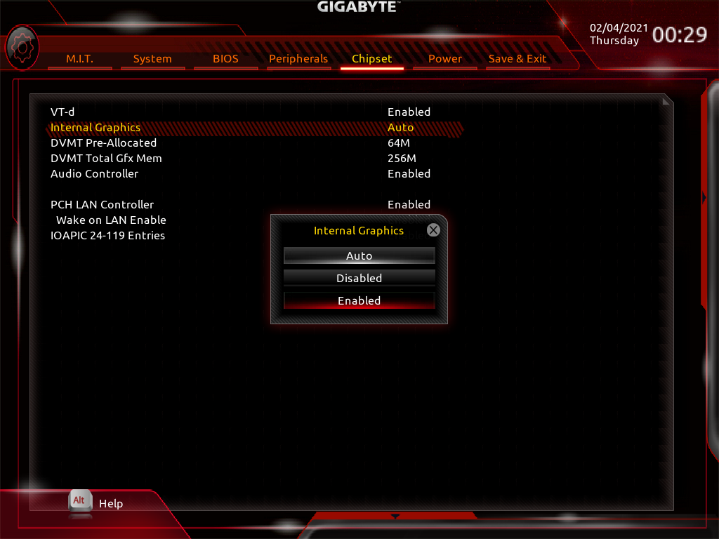 - Chipset → Internal Graphics 를 Enabled로 변경합니다.