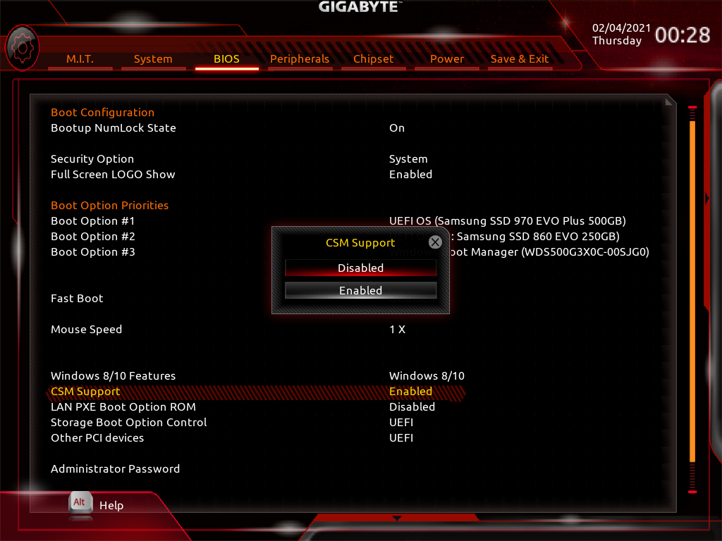 - BIOS → CSM Support를 Disable 로 변경합니다.