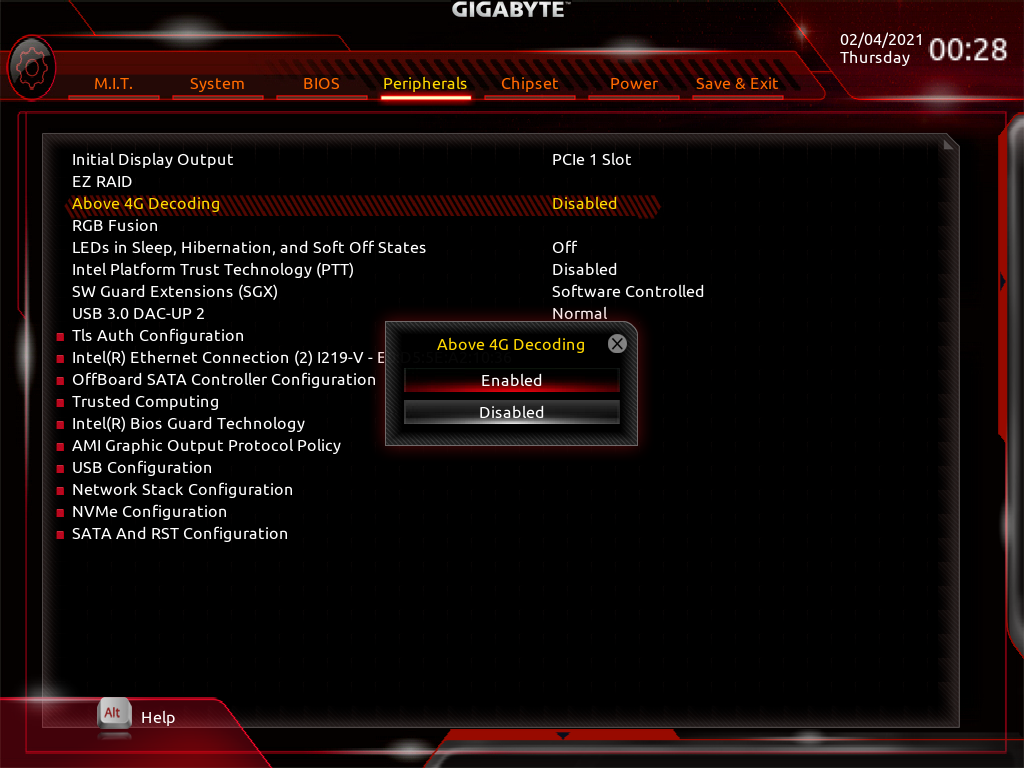 - Peripherals → Abobe 4G Decoding 를 Enable 로 변경합니다.