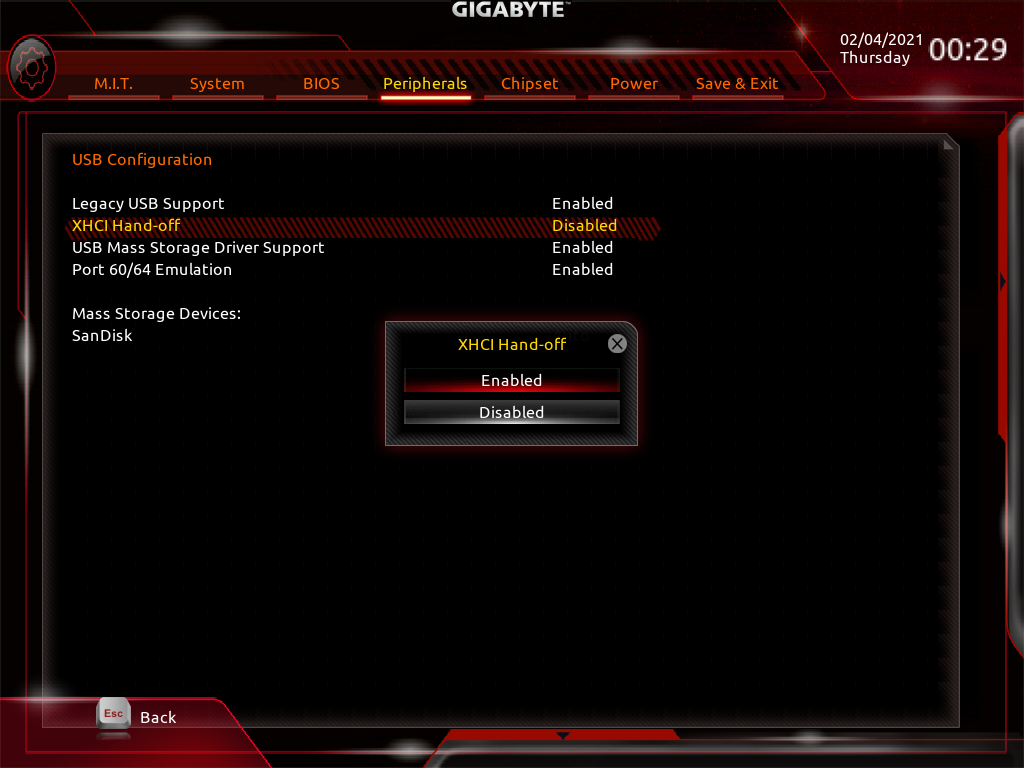 - XHCI Hand-off 를 Disabled로 변경합니다.