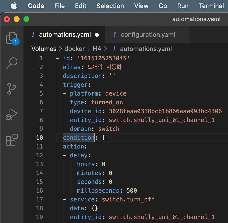 HA에서 스위치가 쳐지면 500밀리 초 동안 ON으로 뒀다가 바로 OFF로 전환하도록 자동화 해주었습니다.