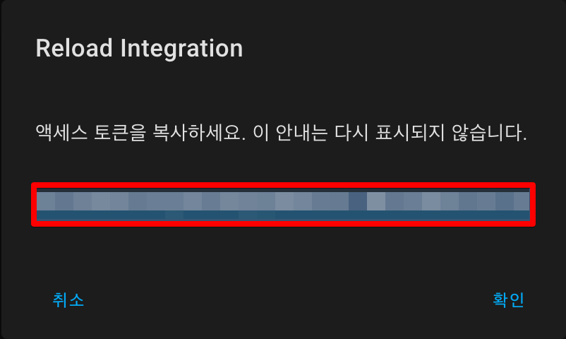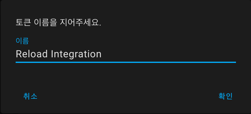 토큰 이름을 지정합니다. 전 간단히 Reload Intergration 으로 했습니다.