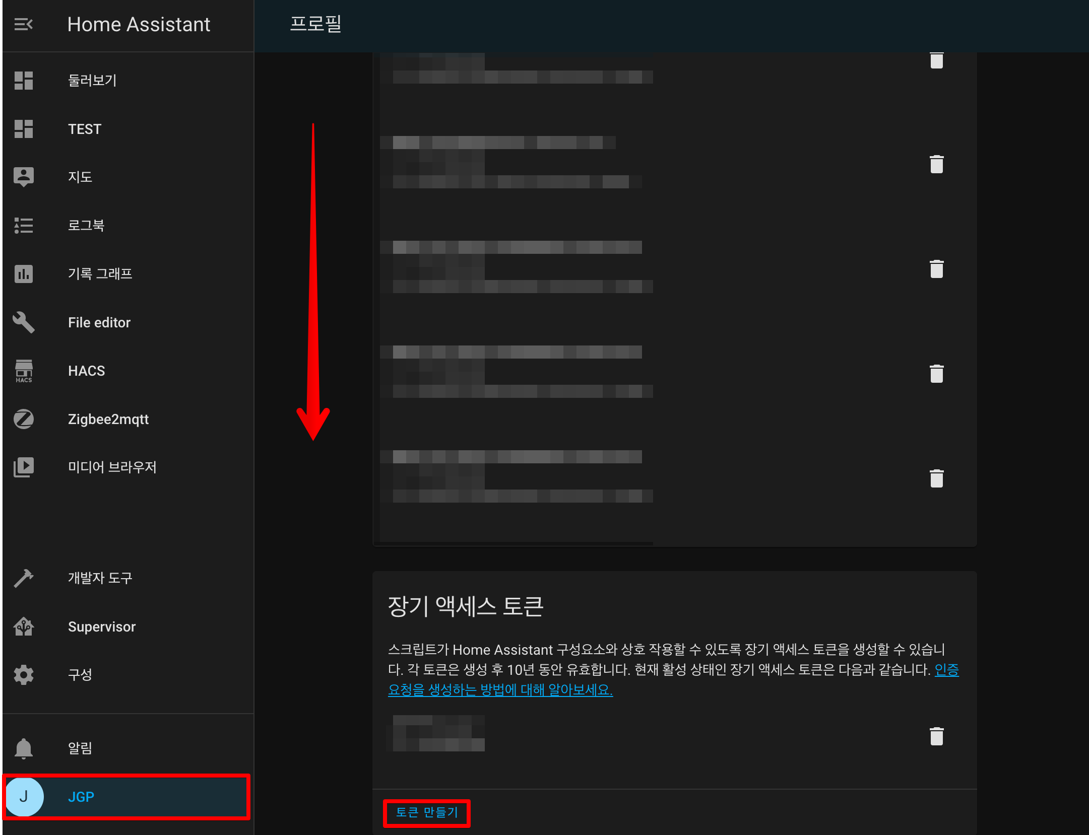 - 아래쪽으로 계속 스크롤하여 '장기 액세스 토큰' 항목을 찾습니다.