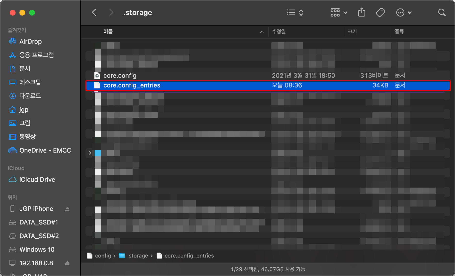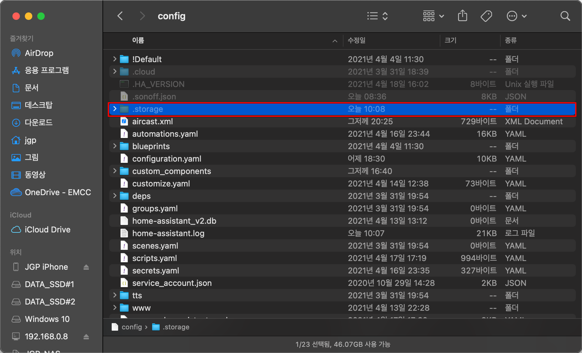 /config 폴더에서 숨겨진 파일 보기를 활성화 한 후, .storage 폴더로 접근합니다.