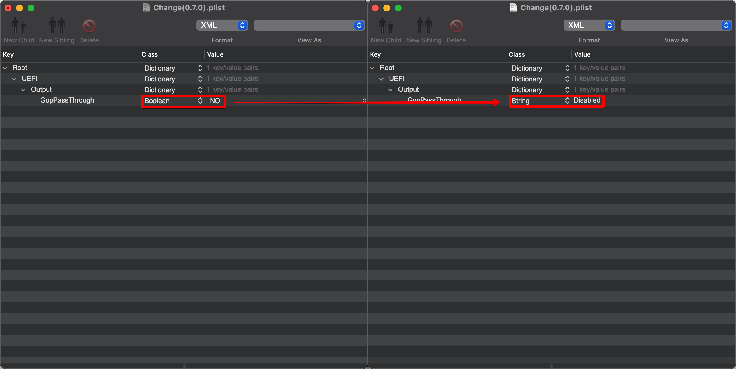 - UEFI - Output - GopPassThrough 항목이 기존 Boolean, No 에서 String, Disabled로 변경되었습니다.