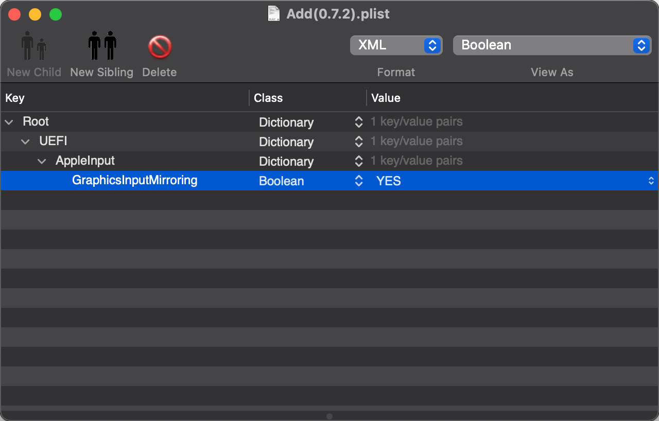 - UEFI - AppleInput - GraphicsInputMirroring (Boolean, 추천값 : YES)