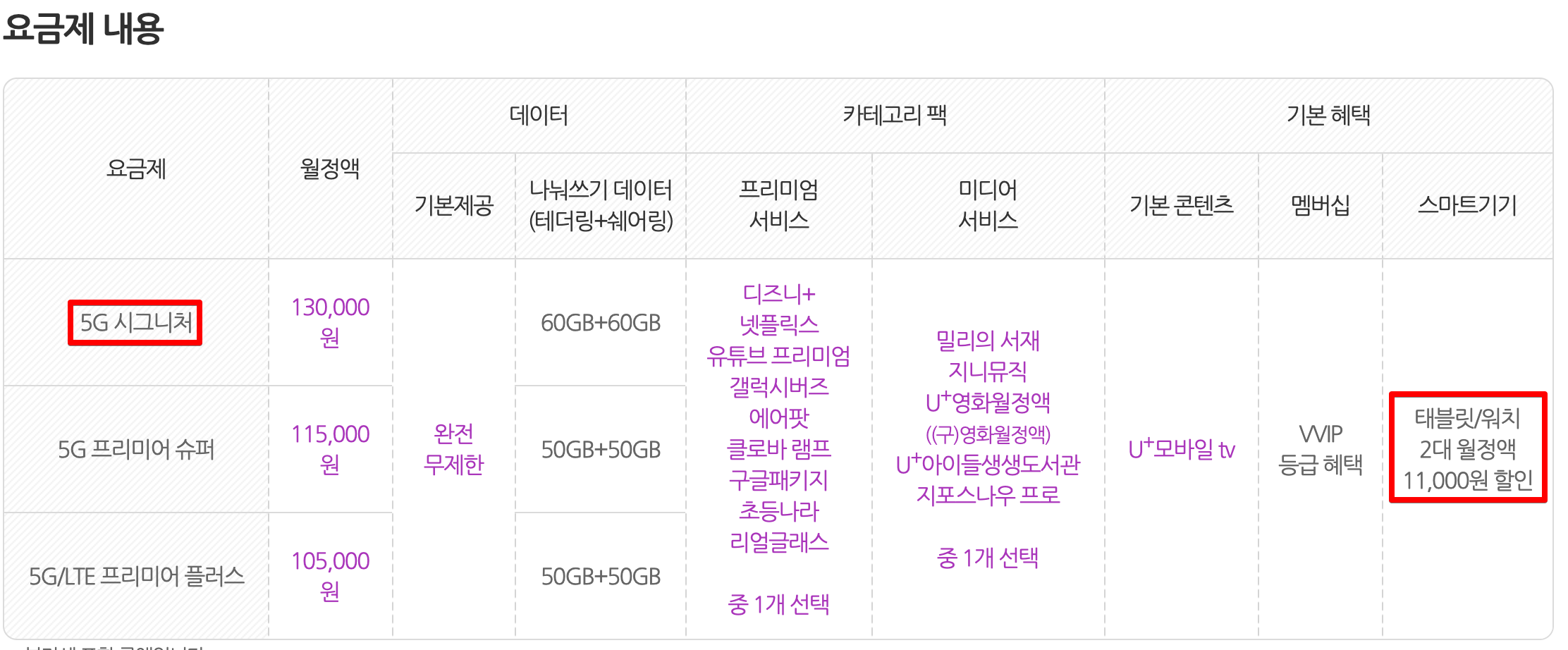 메인 회선 요금제는 U+ 5G 요금제 중 가장 상위 요금제인 5G 시그니처 (월 13만원)입니다.