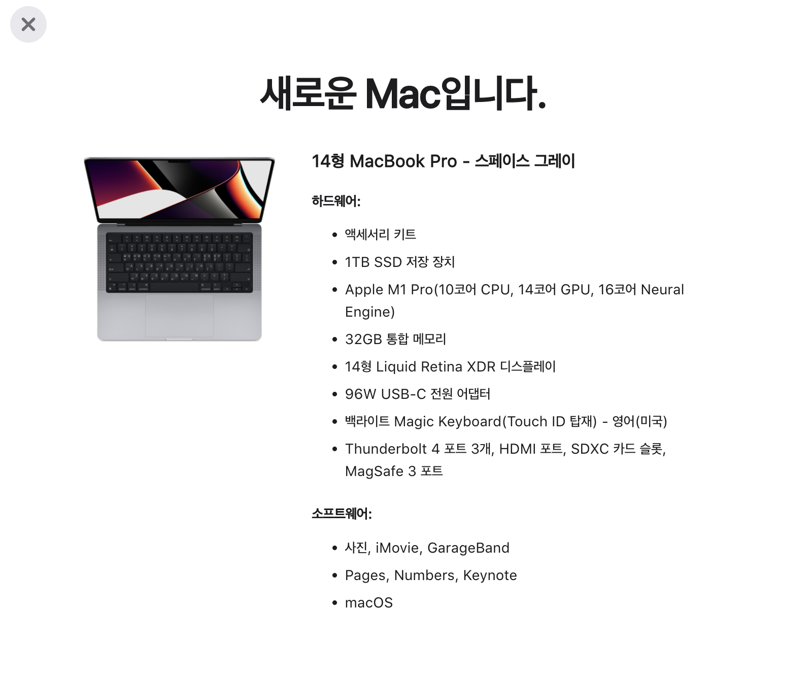 14인치 기본 모델에서 APU를 M1 Pro 중간사양으로 올리고, 32GB 메모리와 1TB SSD를 선택했습니다.
