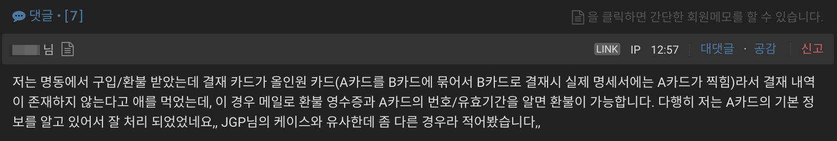 사실 전 카드번호를 알고 있기 때문에 이 방법으로 환불 진행 후 재구매를 했다면 완벽한 시나리오 였을 것입니다.