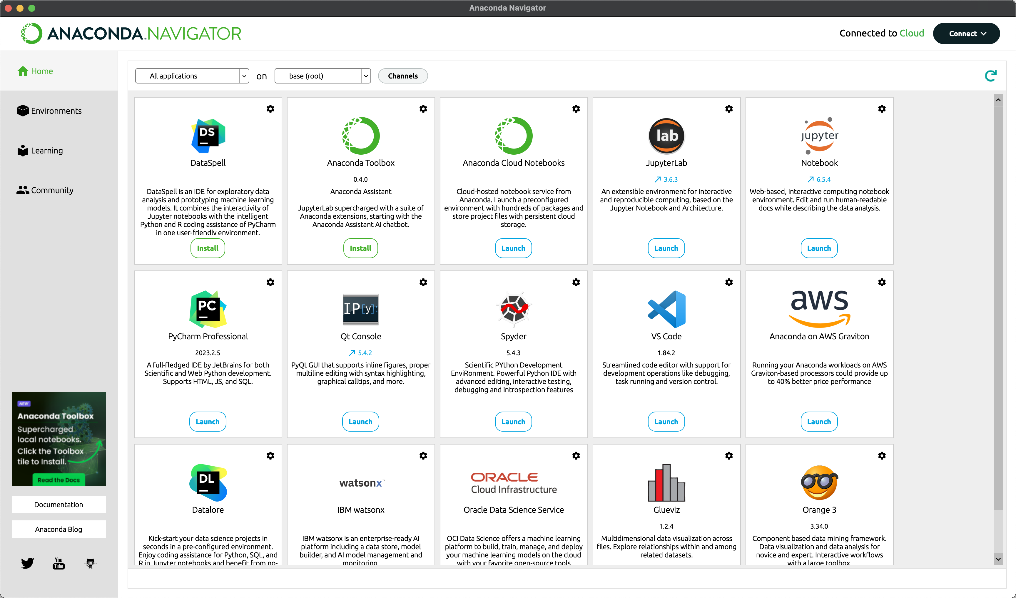 설치가 완료된 후 Anaconda Navigator를 실행하여 위와 같은 화면이 나온다면 설치가 잘 된 것입니다.