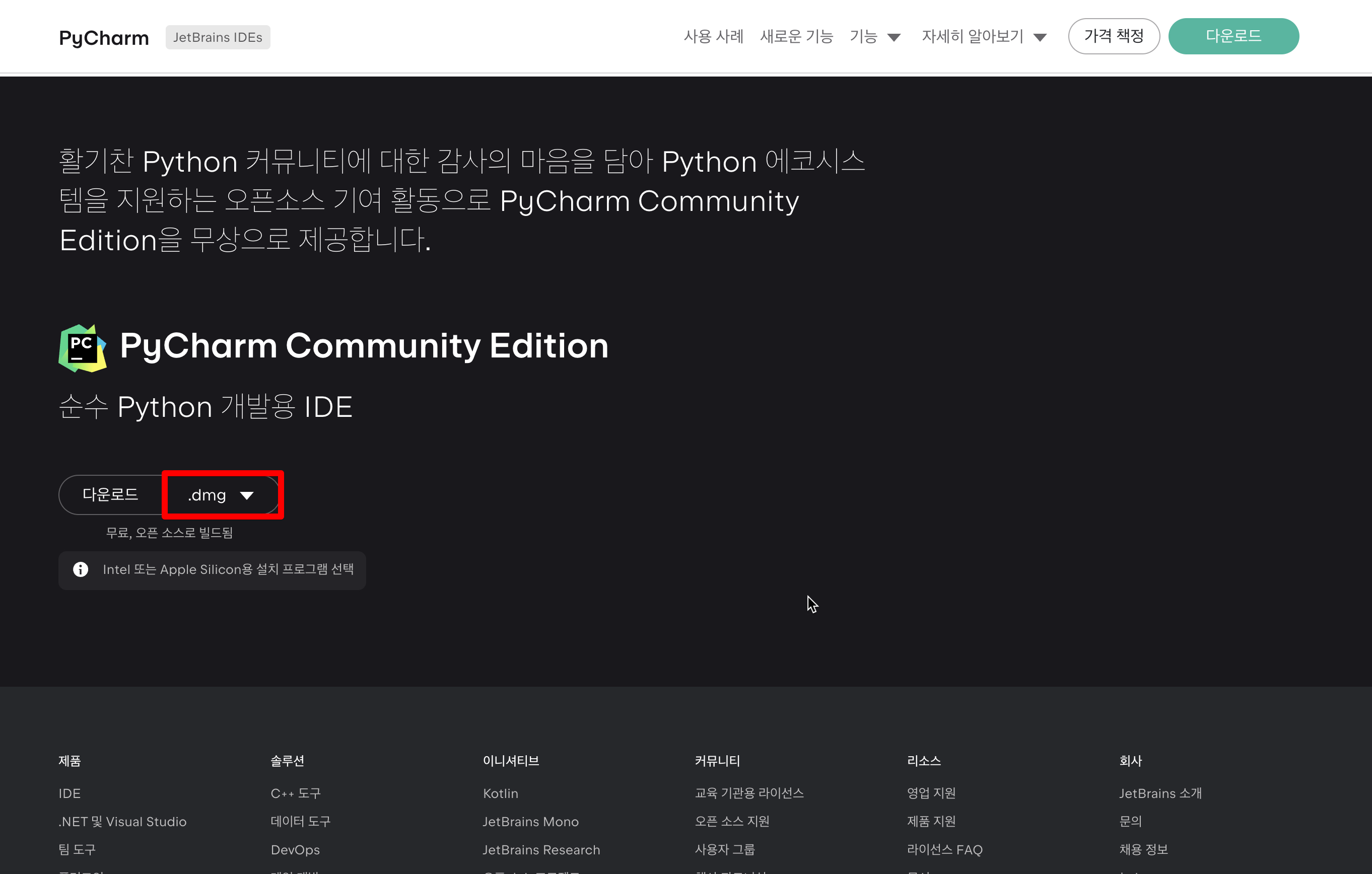 - .dmg 버튼을 눌러 사용 중인 Mac의 플랫폼(Apple Silicon, Intel)을 선택한 후 다운로드 버튼을 눌러 설치 파일을 다운로드합니다.