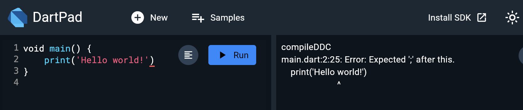 Dart에서는 세미콜론을 찍지 않아도 되는 경우도 있기 때문에 신경써서 찍어줘야 한다!