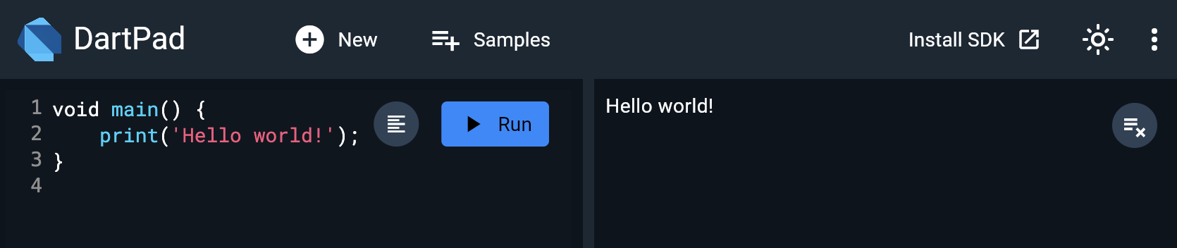 개발환경을 세팅하기 귀찮고, 우선 Dart 언어에 대해 파악하고 싶은 사람은 아래 사이트에서 테스트해보자.